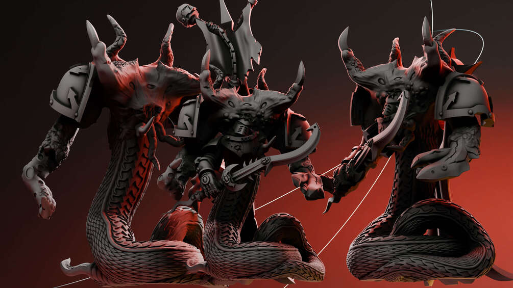 Chaos spawn, mutated marine miniatures for use in Wargame/Tabletop games. These snake themed spawns of chaos come with a few body options and optional pauldrons/flags. One of the bodies has the remains of a marine in power armor with 1 hand holding a sword emerging from its central mass of flesh.
